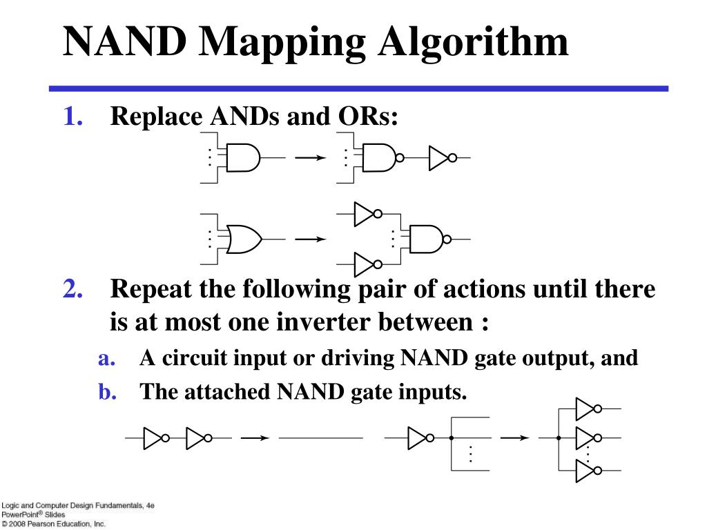 NAND Mapping Algorithm • Replace ANDs and ORs: • Repeat the following pair of actions until there is at most one inverter between : • A circuit input or driving NAND gate output, and • The attached NAND gate inputs.