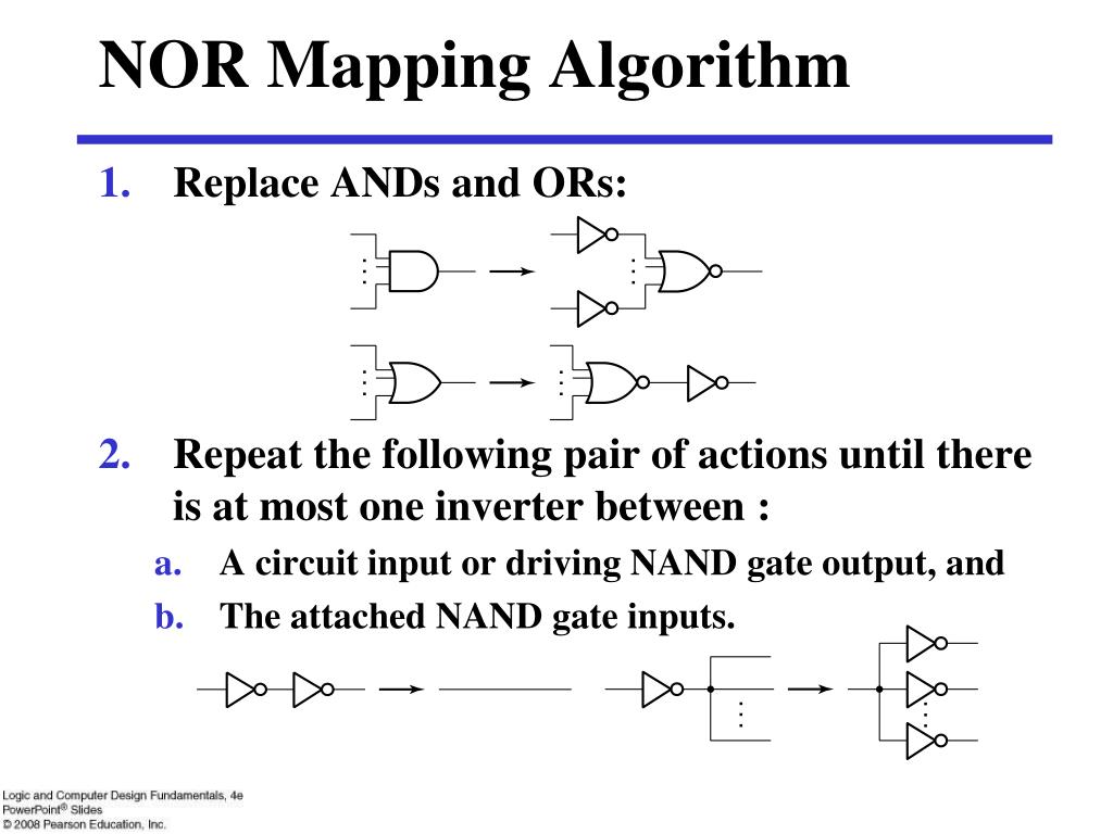 NOR Mapping Algorithm • Replace ANDs and ORs: • Repeat the following pair of actions until there is at most one inverter between : • A circuit input or driving NAND gate output, and • The attached NAND gate inputs.