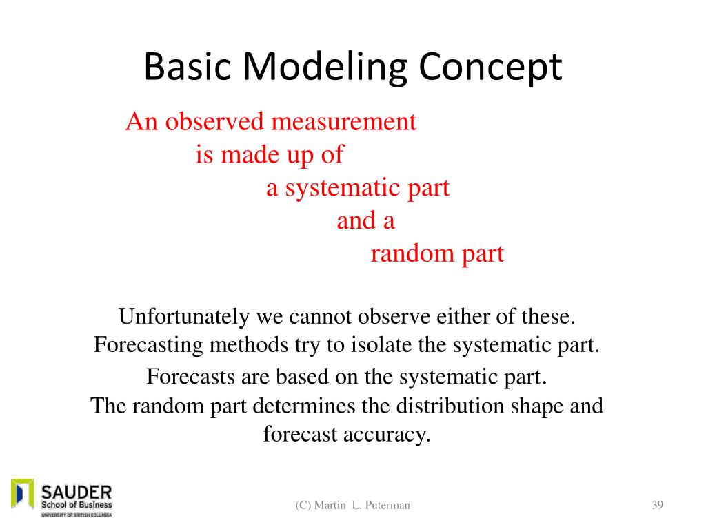 Basic Modeling Concept An observed measurement is made up of a systematic part and a random part Unfortunately we cannot observe either of these. Forecasting methods try to isolate the systematic part. Forecasts are based on the systematic part. The random part determines the distribution shape and forecast accuracy. (C) Martin L. Puterman