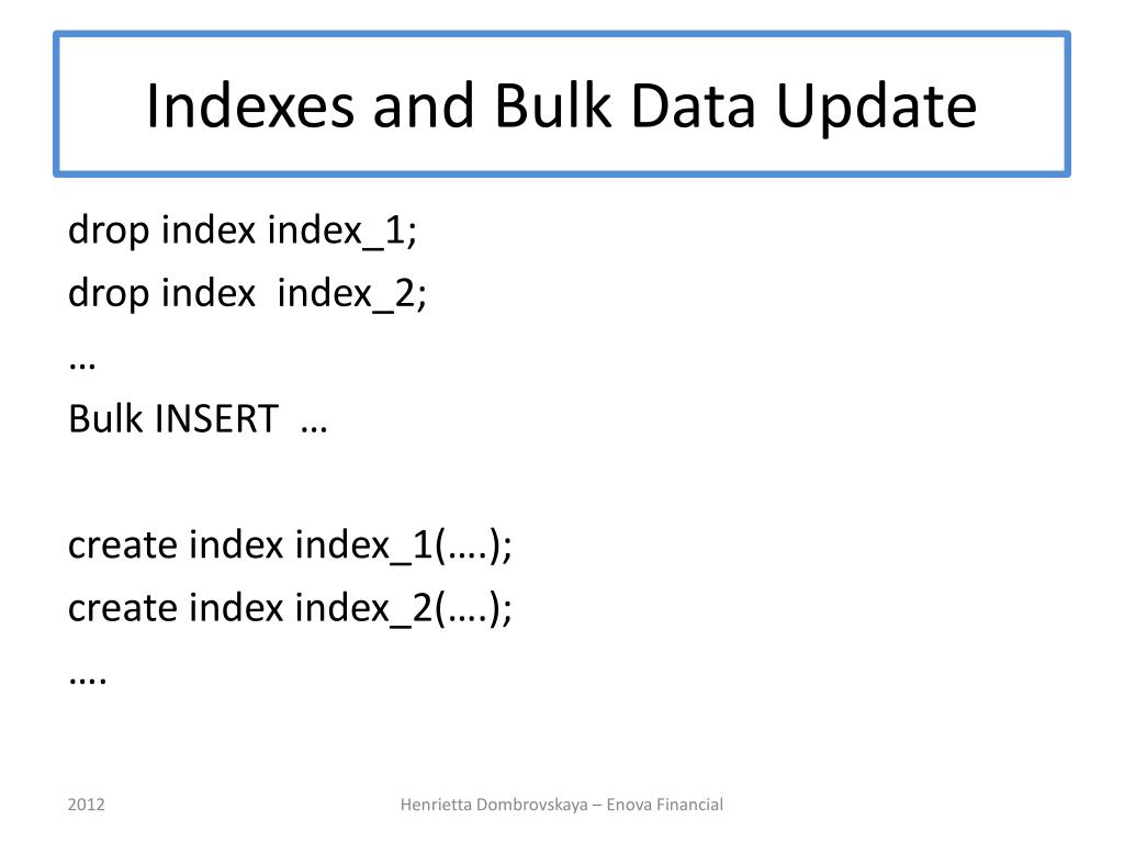 Indexes and Bulk Data Update drop index index_1; drop index index_2; … Bulk INSERT … create index index_1(….); create index index_2(….); …. Henrietta Dombrovskaya – Enova Financial