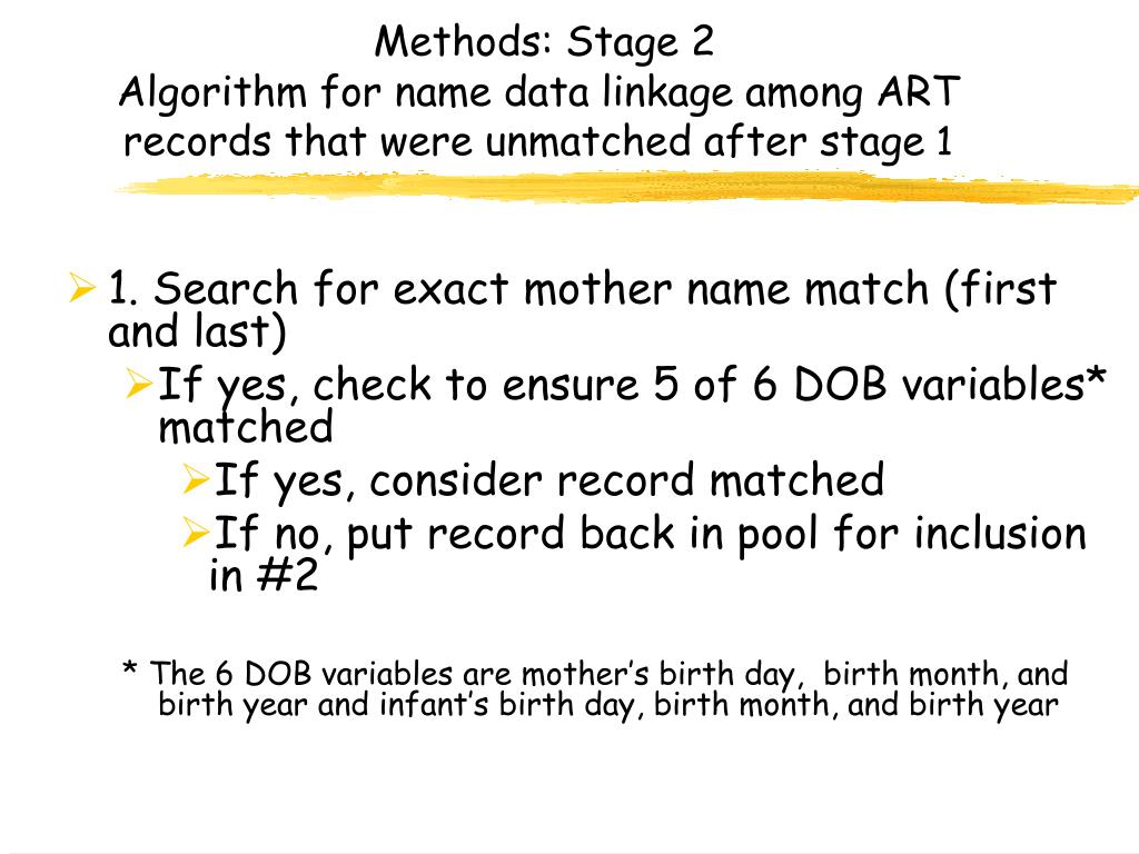 Methods: Stage 2 Algorithm for name data linkage among ART records that were unmatched after stage 1 • 1. Search for exact mother name match (first and last) • If yes, check to ensure 5 of 6 DOB variables* matched • If yes, consider record matched • If no, put record back in pool for inclusion in #2 * The 6 DOB variables are mother’s birth day, birth month, and birth year and infant’s birth day, birth month, and birth year