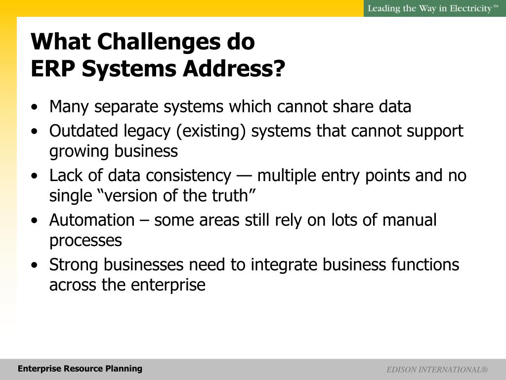 What Challenges do ERP Systems Address? No data sharing Outdated systems Lack of consistency Manual processes Integration