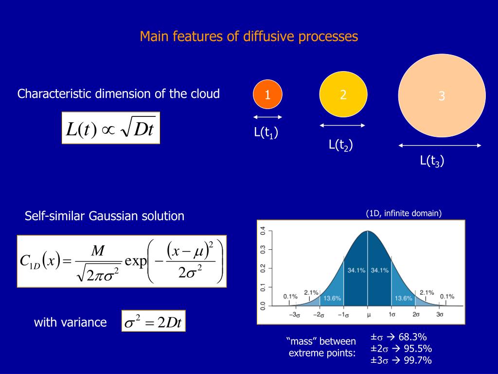 Main features of diffusive processes 3 2 1 Characteristic dimension of the cloud L(t1) L(t2) L(t3) Self-similar Gaussian solution (1D, infinite domain) with variance ±s 68.3% ±2s 95.5% ±3s 99.7% “mass” between extreme points: