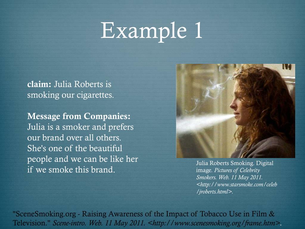 Example 1 claim: Julia Roberts is smoking our cigarettes. Message from Companies: Julia is a smoker and prefers our brand over all others. She's one of the beautiful people and we can be like her if we smoke this brand. Julia Roberts Smoking. Digital image. Pictures of Celebrity Smokers. Web. 11 May 2011. <http://www.starsmoke.com/celeb/jroberts.html>. "SceneSmoking.org - Raising Awareness of the Impact of Tobacco Use in Film & Television." Scene-intro. Web. 11 May 2011. <http://www.scenesmoking.org/frame.htm>.