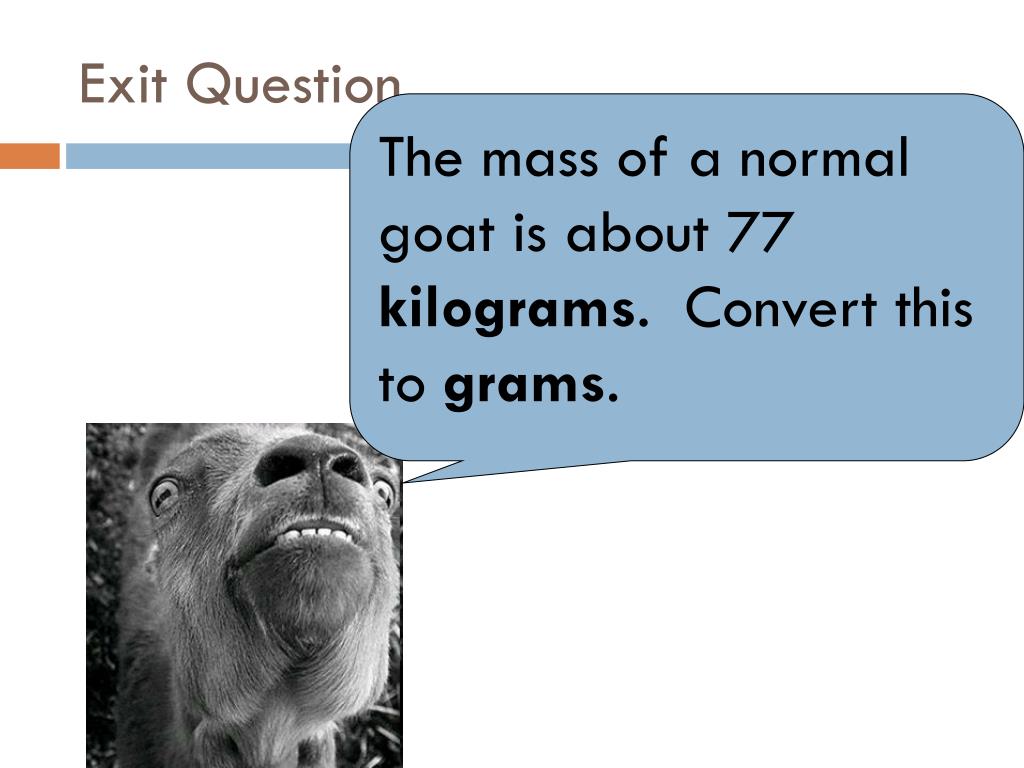 Exit Question The mass of a normal goat is about 77 kilograms. Convert this to grams.