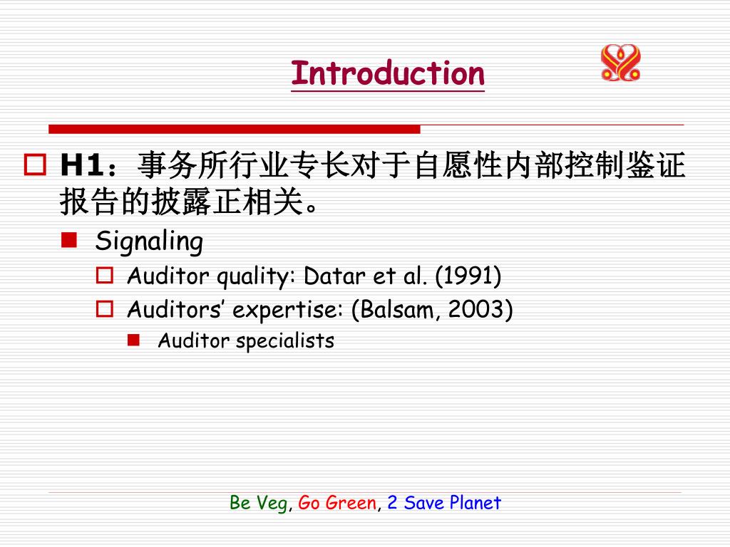 Introduction • H1:事务所行业专长对于自愿性内部控制鉴证报告的披露正相关。 • Signaling • Auditor quality: Datar et al. (1991) • Auditors’ expertise: (Balsam, 2003) • Auditor specialists Be Veg, Go Green, 2Save Planet