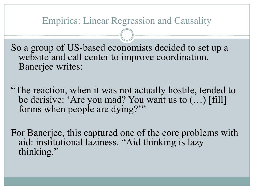 Empirics: Linear Regression and Causality So a group of US-based economists decided to set up a website and call center to improve coordination. Banerjee writes: “The reaction, when it was not actually hostile, tended to be derisive: ‘Are you mad? You want us to (…) [fill] forms when people are dying?’” For Banerjee, this captured one of the core problems with aid: institutional laziness. “Aid thinking is lazy thinking.”