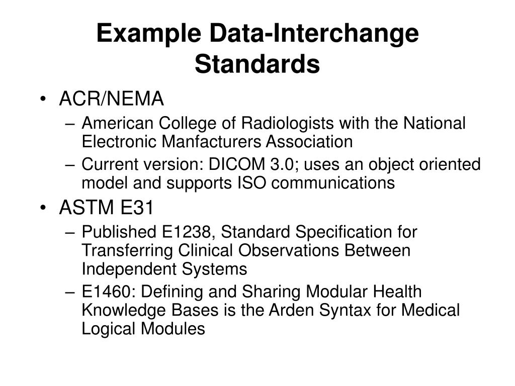 Example Data-Interchange Standards • ACR/NEMA • American College of Radiologists with the National Electronic Manfacturers Association • Current version: DICOM 3.0; uses an object oriented model and supports ISO communications • ASTM E31 • Published E1238, Standard Specification for Transferring Clinical Observations Between Independent Systems • E1460: Defining and Sharing Modular Health Knowledge Bases is the Arden Syntax for Medical Logical Modules