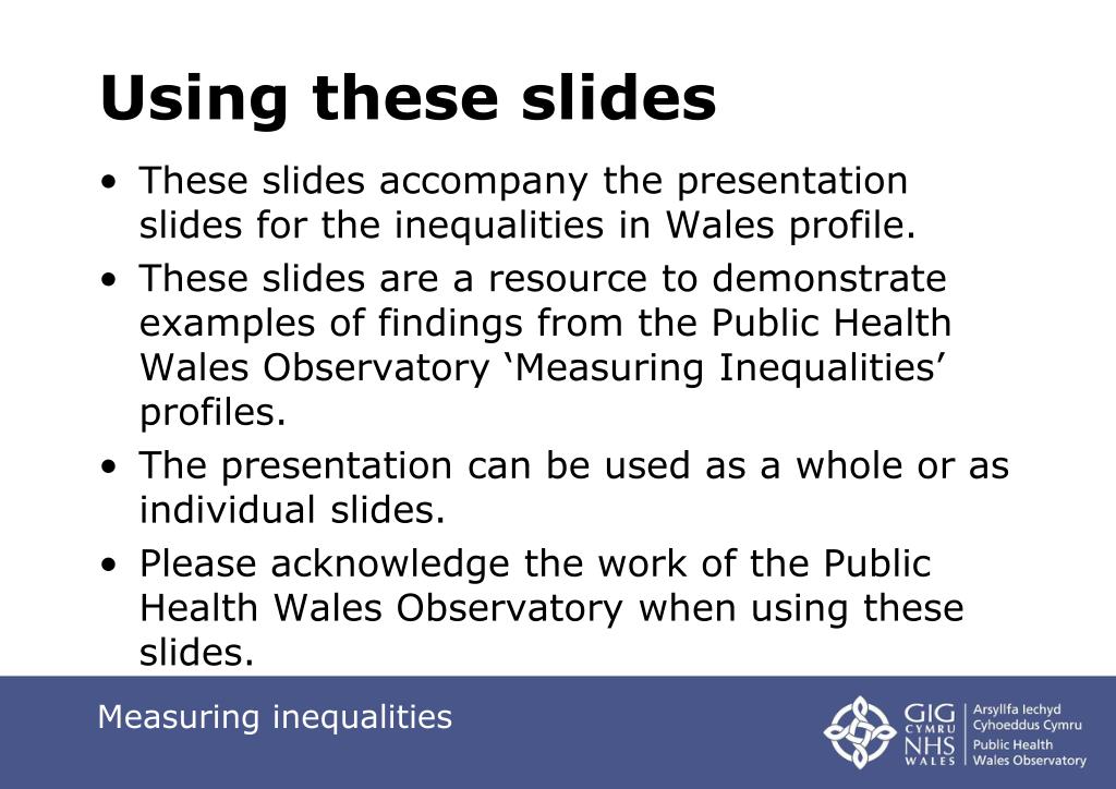 Using these slides • These slides accompany the presentation slides for the inequalities in Wales profile. • These slides are a resource to demonstrate examples of findings from the Public Health Wales Observatory ‘Measuring Inequalities’ profiles. • The presentation can be used as a whole or as individual slides. • Please acknowledge the work of the Public Health Wales Observatory when using these slides. Measuring inequalities