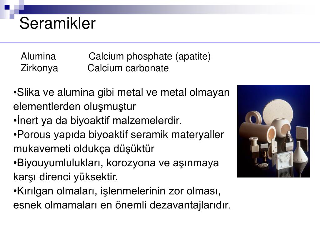 Seramikler AluminaCalcium phosphate (apatite) Zirkonya Calcium carbonate • Slika ve alumina gibi metal ve metal olmayan elementlerden oluşmuştur • İnert ya da biyoaktif malzemelerdir. • Porous yapıda biyoaktif seramik materyallermukavemeti oldukça düşüktür • Biyouyumlulukları, korozyona ve aşınmaya karşı direnci yüksektir. • Kırılgan olmaları, işlenmelerinin zor olması, esnek olmamaları en önemli dezavantajlarıdır.