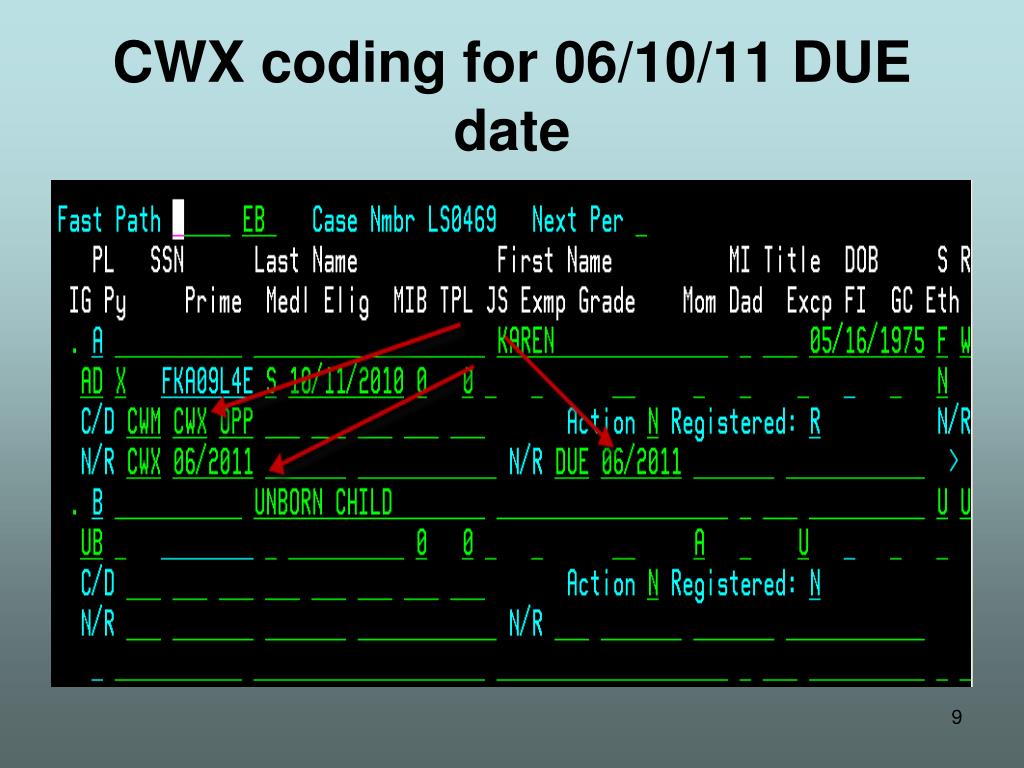 CWX coding example • Morena is pregnant and due 06/10/11.The DUE date is entered as DUE 06/11. Since 06/10/11 is before 06/15/11, the CWX end date is 06/11. • If Morena were due 06/20/11, the DUE date would be 06/11, but the CWX date would be 07/11 to provide time for a 10-day notice.