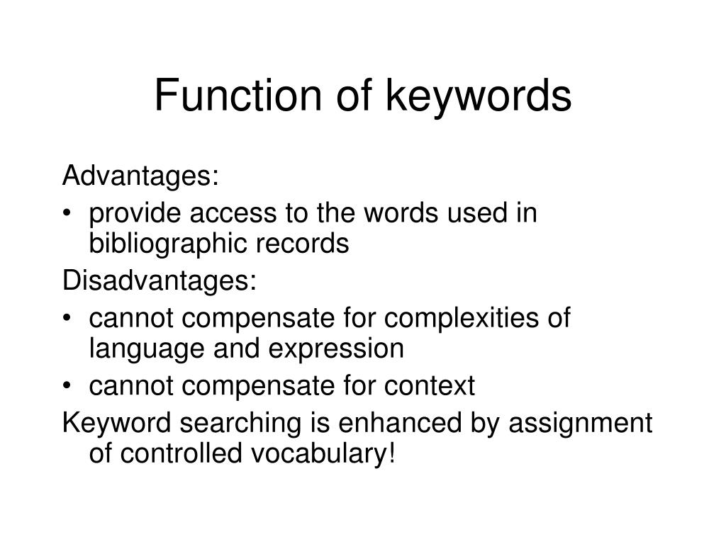 Function of keywords Advantages: • provide access to the words used in bibliographic records Disadvantages: • cannot compensate for complexities of language and expression • cannot compensate for context Keyword searching is enhanced by assignment of controlled vocabulary!