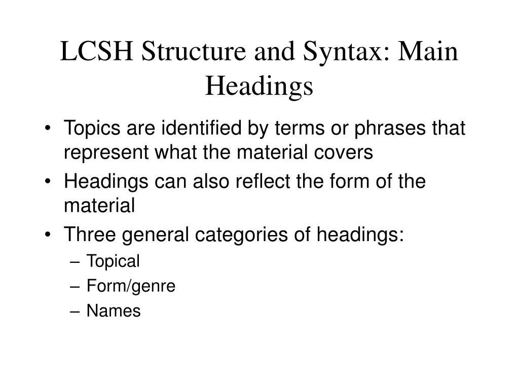 LCSH Structure and Syntax: Main Headings • Topics are identified by terms or phrases that represent what the material covers • Headings can also reflect the form of the material • Three general categories of headings: • Topical • Form/genre • Names