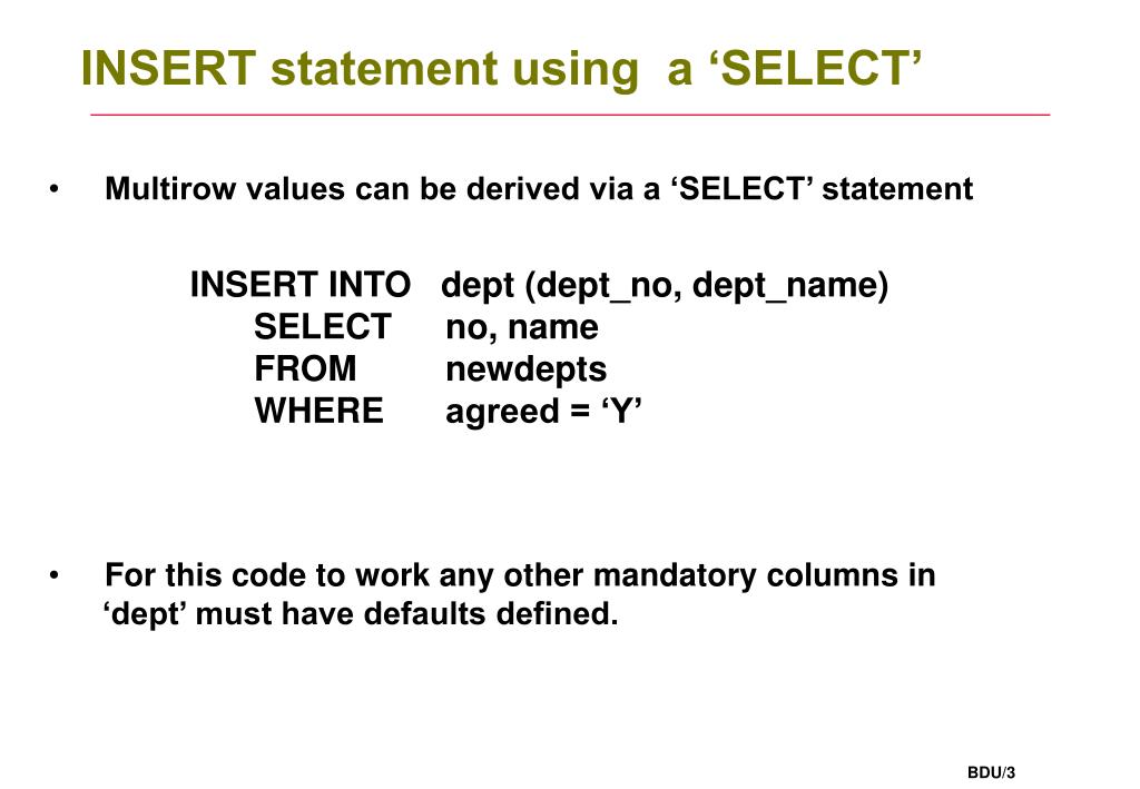 INSERT statement using a ‘SELECT’ • Multirow values can be derived via a ‘SELECT’ statement • For this code to work any other mandatory columns in • ‘dept’ must have defaults defined. • INSERT INTO dept (dept_no, dept_name) • SELECT no, name • FROM newdepts • WHERE agreed = ‘Y’