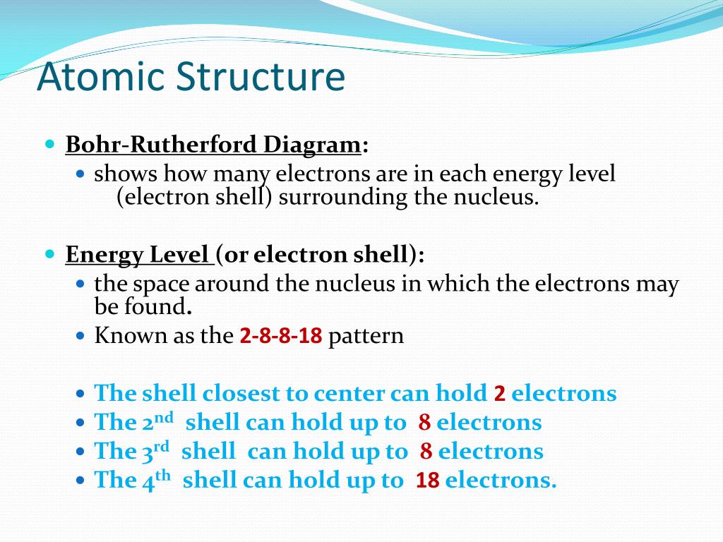 Atomic Structure • Bohr-Rutherford Diagram: • shows how many electrons are in each energy level (electron shell) surrounding the nucleus. • Energy Level (or electron shell): • the space around the nucleus in which the electrons may be found. • Known as the 2-8-8-18pattern • The shell closest to center can hold 2 electrons • The 2nd shell can hold up to 8 electrons • The 3rd shell can hold up to 8 electrons • The 4thshell can hold up to 18 electrons.