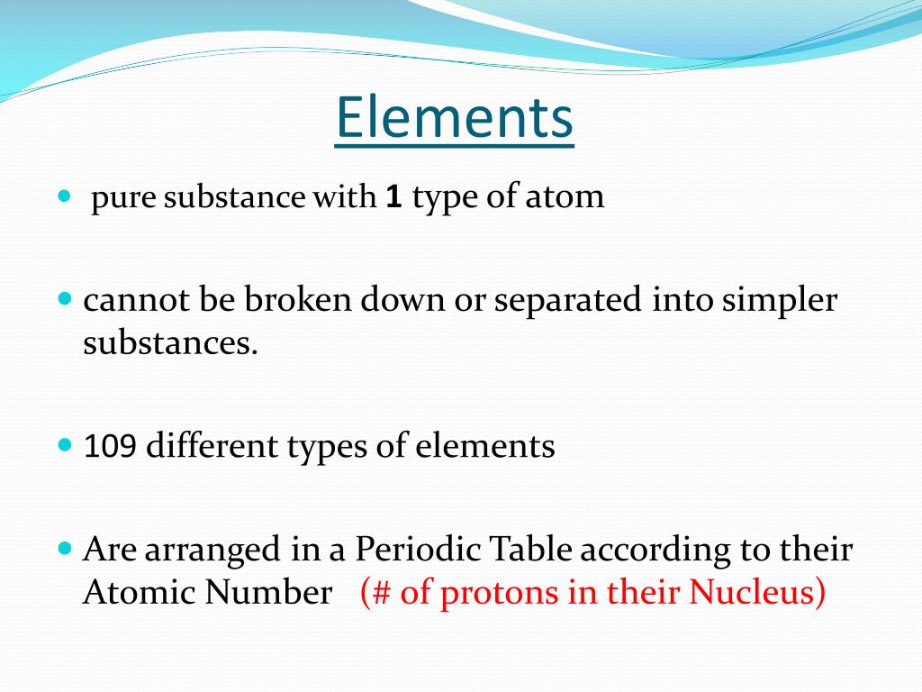 Elements • pure substance with 1type of atom • cannot be broken down or separated into simpler substances. • 109 different types of elements • Are arranged in a Periodic Table according to their Atomic Number (# of protons in their Nucleus)