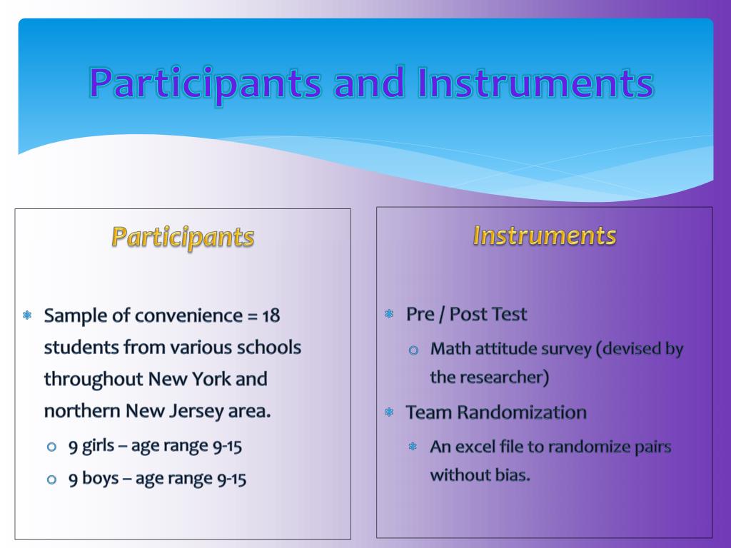 Participants and Instruments Participants • Sample of convenience = 18 students from various schools throughout New York and northern New Jersey area. • 9 girls – age range 9-15 • 9 boys – age range 9-15 Instruments • Pre / Post Test • Math attitude survey (devised by the researcher) • Team Randomization • An excel file to randomize pairs without bias.