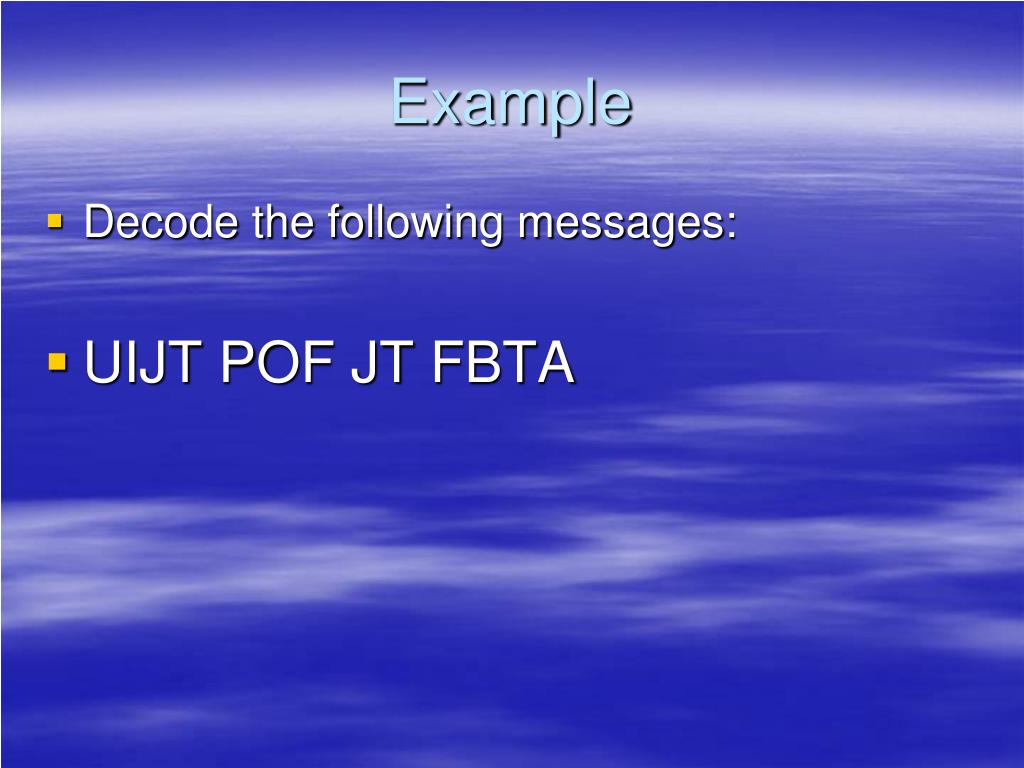Example • Decode the following messages: • UIJT POF JT FBTA