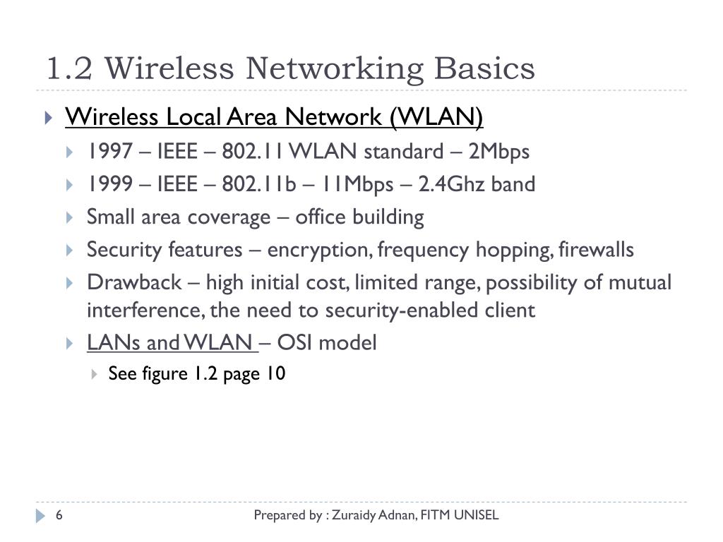 1.2 Wireless Networking Basics • Wireless Local Area Network (WLAN) • 1997 – IEEE – 802.11 WLAN standard – 2Mbps • 1999 – IEEE – 802.11b – 11Mbps – 2.4Ghz band • Small area coverage – office building • Security features – encryption, frequency hopping, firewalls • Drawback – high initial cost, limited range, possibility of mutual interference, the need to security-enabled client • LANs and WLAN – OSI model • See figure 1.2 page 10 Prepared by : Zuraidy Adnan, FITM UNISEL