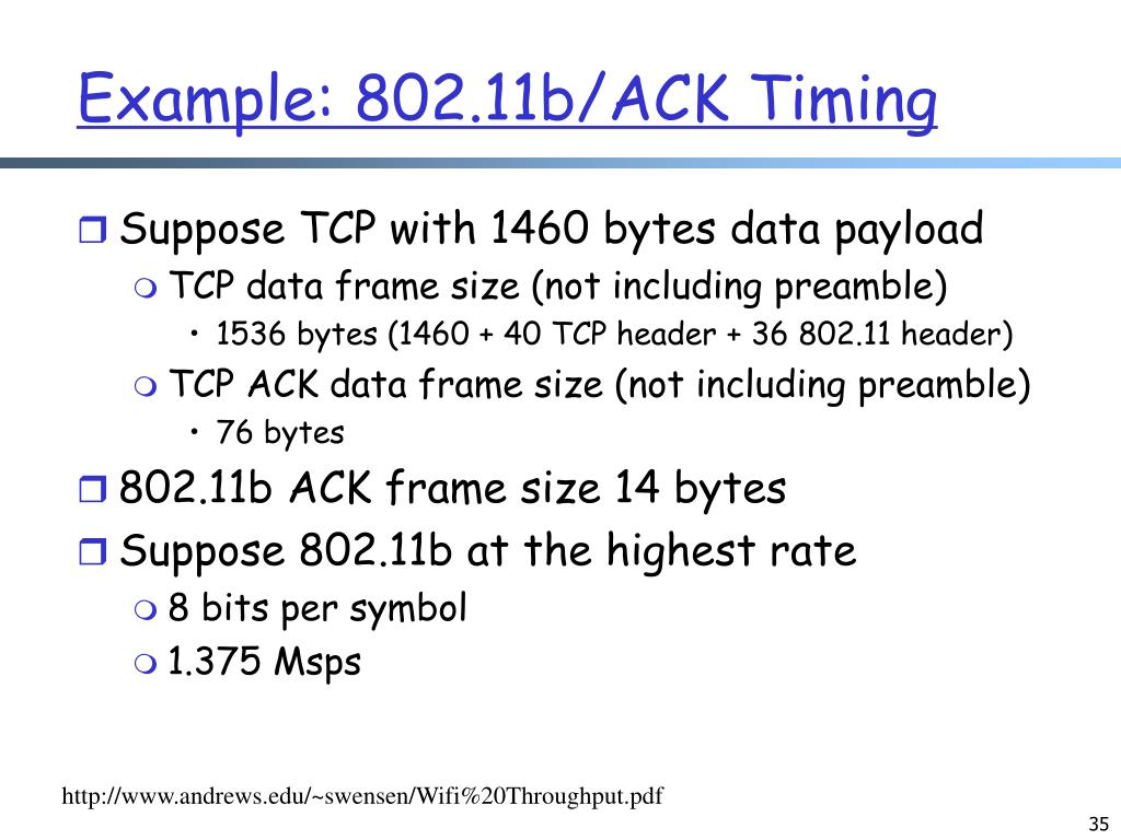 Example: 802.11b/ACK Timing • Suppose TCP with 1460 bytes data payload • TCP data frame size (not including preamble) • 1536 bytes (1460 + 40 TCP header + 36 802.11 header) • TCP ACK data frame size (not including preamble) • 76 bytes • 802.11b ACK frame size 14 bytes • Suppose 802.11b at the highest rate • 8 bits per symbol • 1.375 Msps http://www.andrews.edu/~swensen/Wifi%20Throughput.pdf