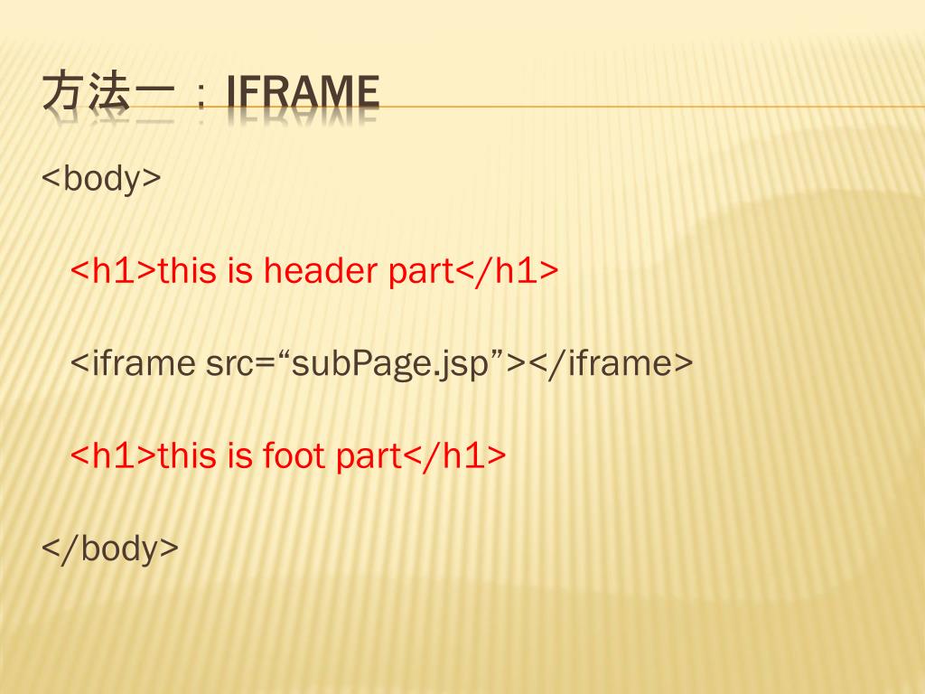<body> <h1>this is header part</h1> <iframesrc=“subPage.jsp”></iframe> <h1>this is foot part</h1> </body> 方法一:Iframe
