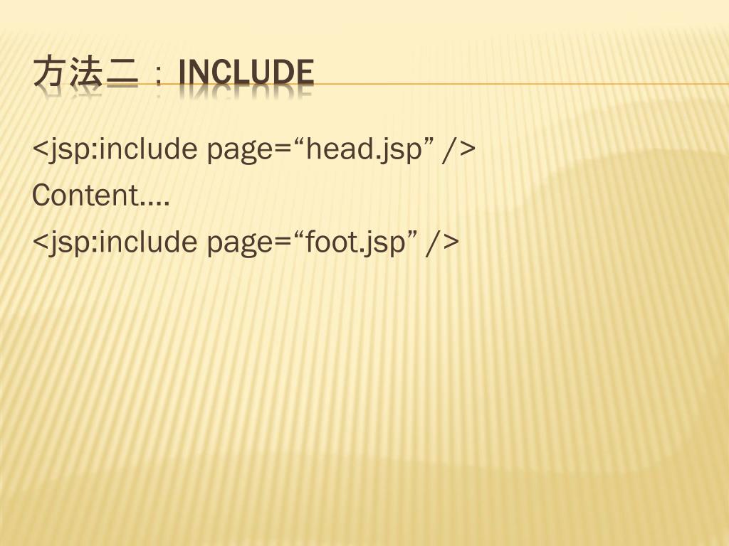 <jsp:include page=“head.jsp” /> Content…. <jsp:include page=“foot.jsp” /> 方法二:include