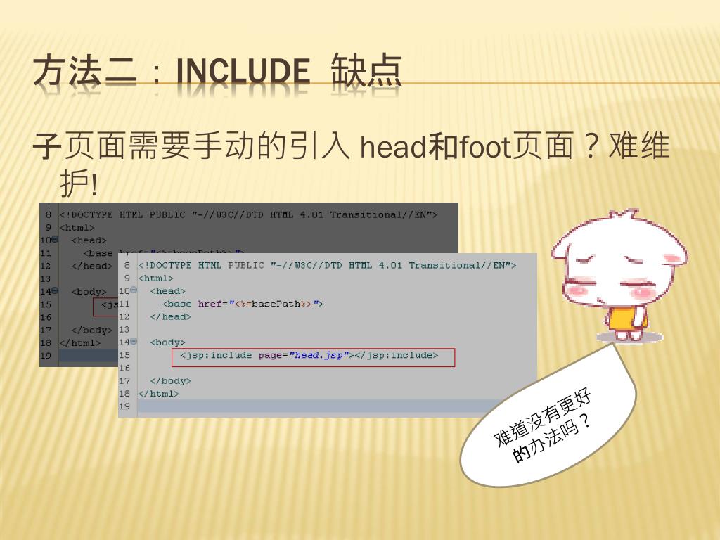 子页面需要手动的引入 head和foot页面?难维护! 方法二:include 缺点 难道没有更好的办法吗?