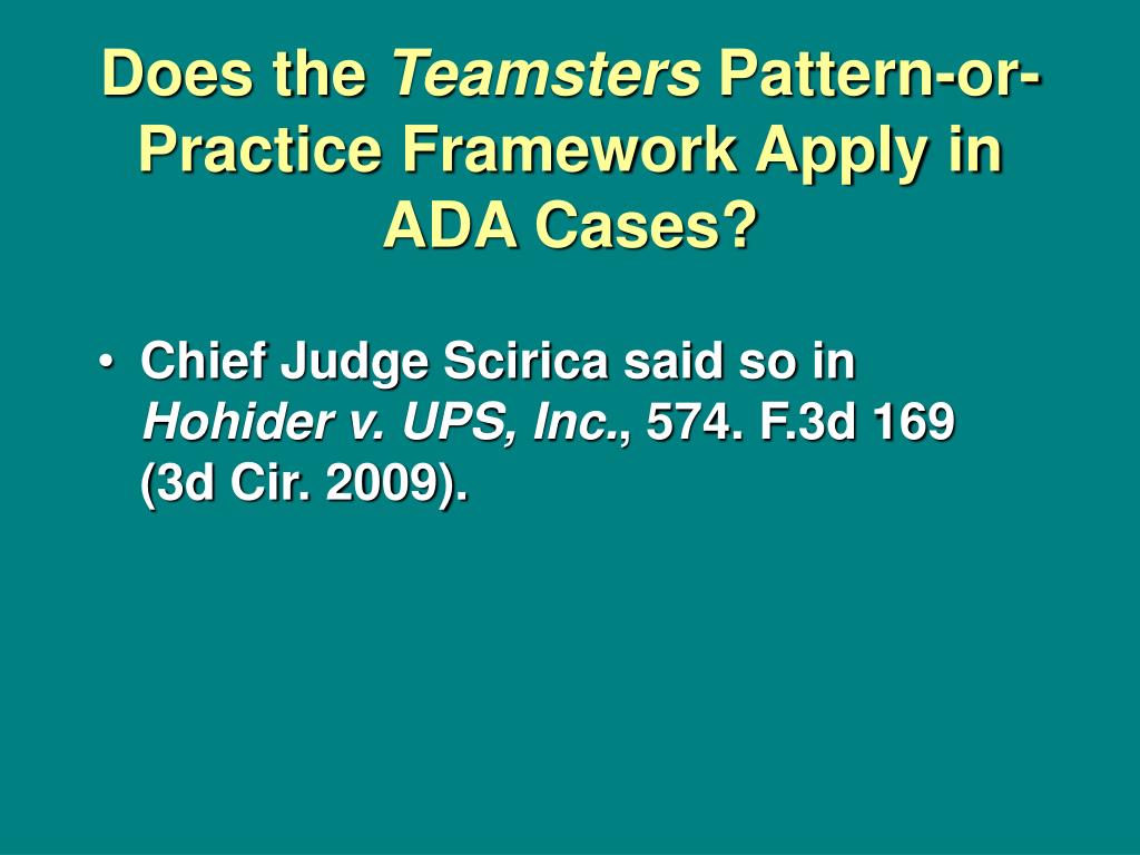 Does the Teamsters Pattern-or-Practice Framework Apply in ADA Cases? • Chief Judge Scirica said so in Hohider v. UPS, Inc., 574. F.3d 169 (3d Cir. 2009).