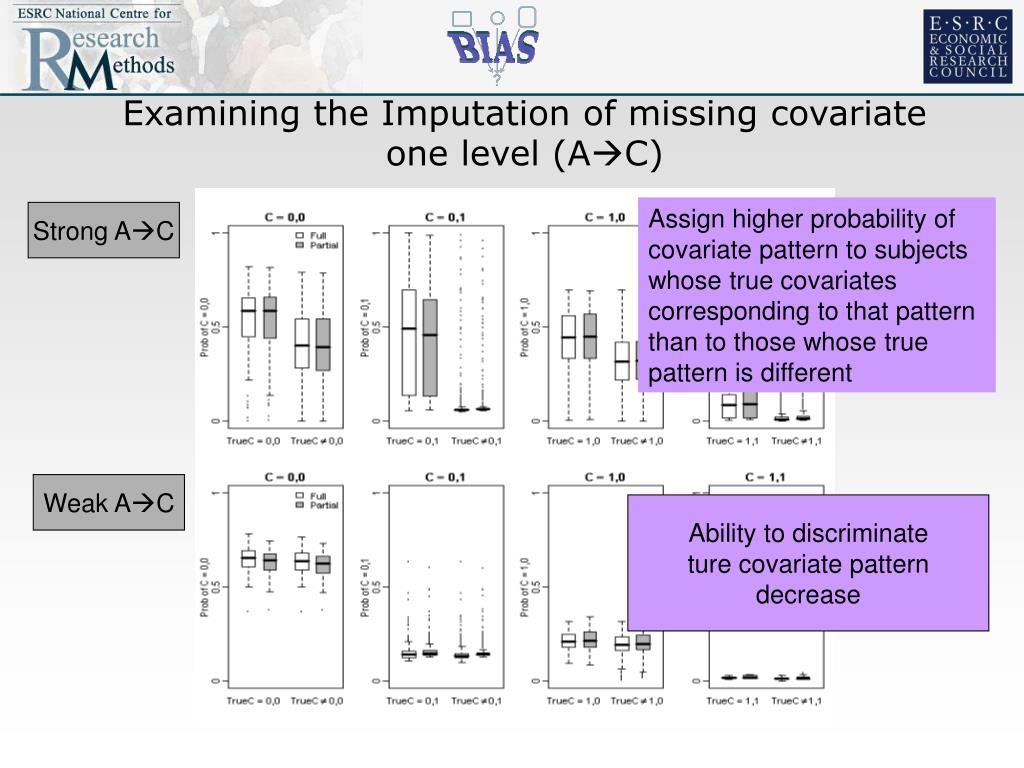 Examining the Imputation of missing covariateone level (AC) Assign higher probability of covariate pattern to subjects whose true covariates corresponding to that pattern than to those whose true pattern is different Strong AC Weak AC Ability to discriminate ture covariate pattern decrease