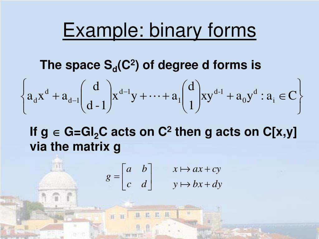 Example: binary forms The space Sd(C2) of degree d forms is If g G=Gl2C acts on C2 then g acts on C[x,y]via the matrix g