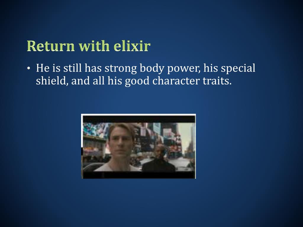 Return with elixir • He is still has strong body power, his special shield, and all his good character traits.