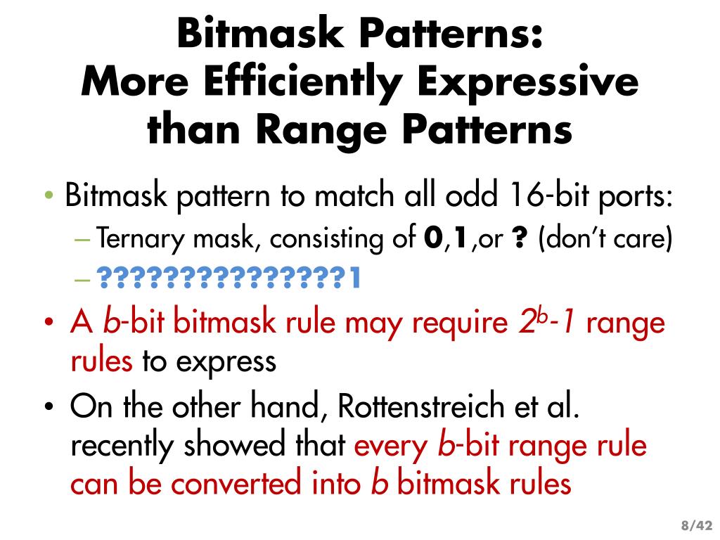 Bitmask Patterns: More Efficiently Expressive than Range Patterns • Bitmask pattern to match all odd 16-bit ports: • Ternary mask, consisting of 0,1,or ? (don’t care) • ???????????????1 • A b-bit bitmask rule may require 2b-1 range rules to express • On the other hand, Rottenstreich et al. recently showed that every b-bit range rule can be converted into b bitmask rules