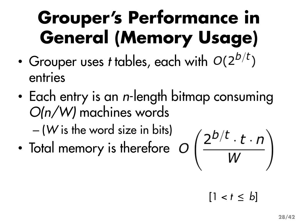 Grouper’s Performance in General (Memory Usage) • Grouper uses t tables, each with entries • Each entry is an n-length bitmap consuming O(n/W) machines words • (W is the word size in bits) • Total memory is therefore[1<t ≤b]