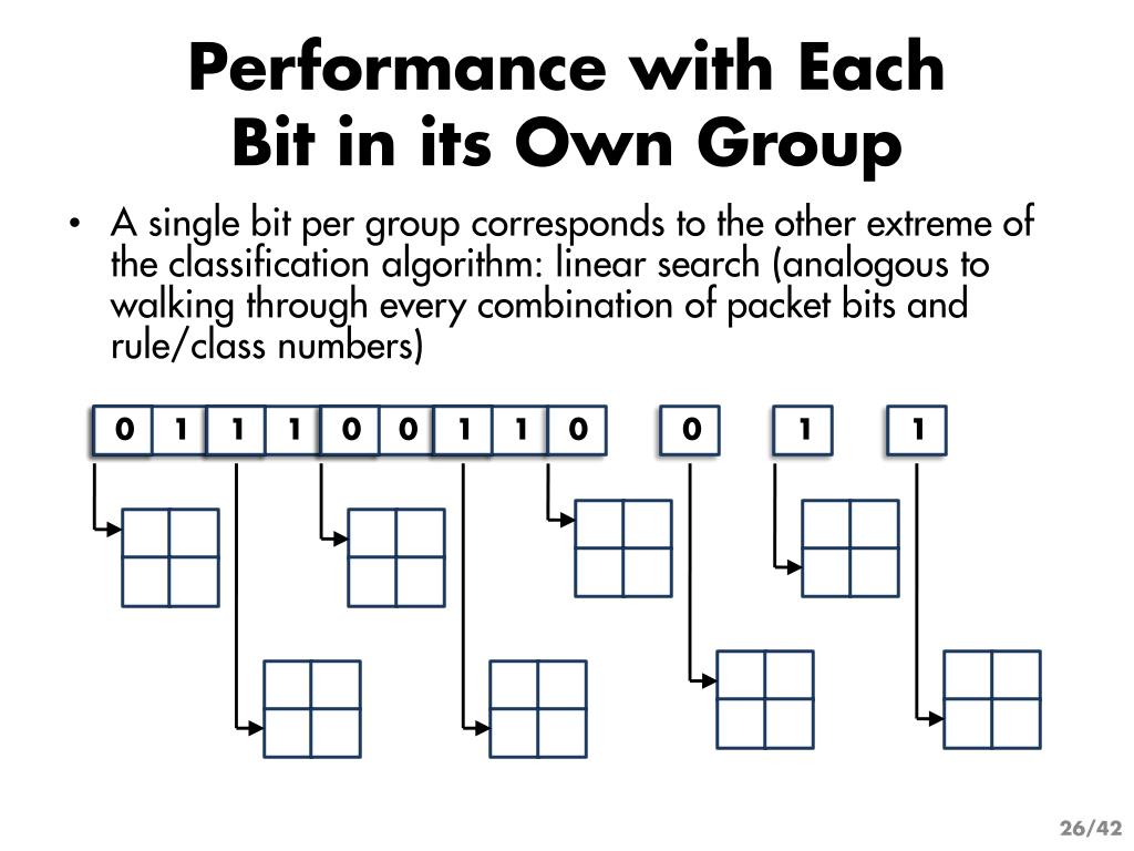 Performance with Each Bit in its Own Group • A single bit per group corresponds to the other extreme of the classification algorithm: linear search (analogous to walking through every combination of packet bits and rule/class numbers) 0 1 0 1 0 0 1 1 0 1 0 1 0 0 1 1