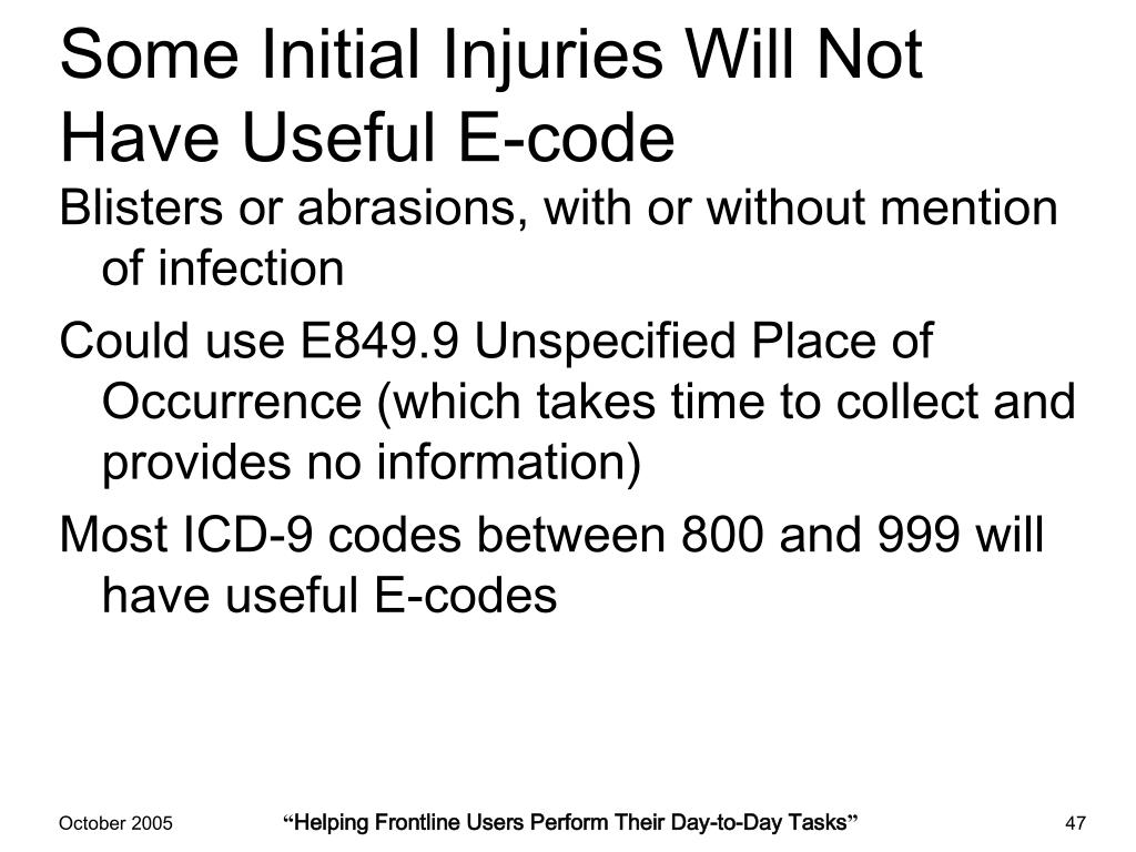 Some Initial Injuries Will Not Have Useful E-code • Blisters or abrasions, with or without mention of infection • Could use E849.9 Unspecified Place of Occurrence (which takes time to collect and provides no information) • Most ICD-9 codes between 800 and 999 will have useful E-codes October 2005“Helping Frontline Users Perform Their Day-to-Day Tasks”47