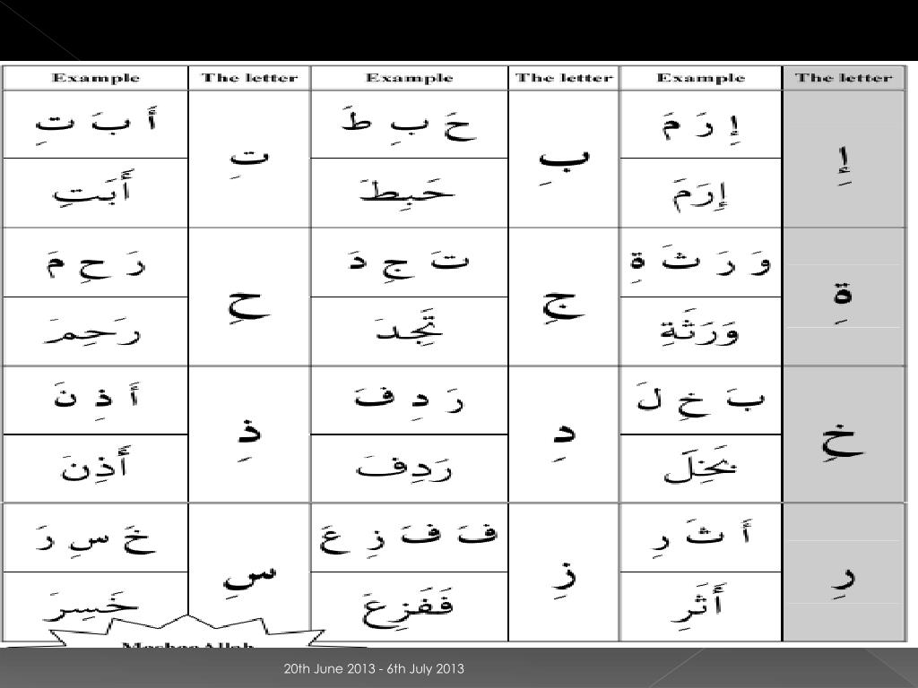 Read • http://www.abouttajweed.com/the-characteristics-of-the-arabic-letters/index.php 20th June 2013 - 6th July 2013