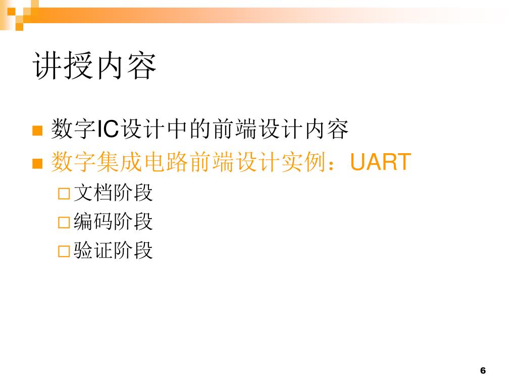 讲授内容 • 数字IC设计中的前端设计内容 • 数字集成电路前端设计实例:UART • 文档阶段 • 编码阶段 • 验证阶段