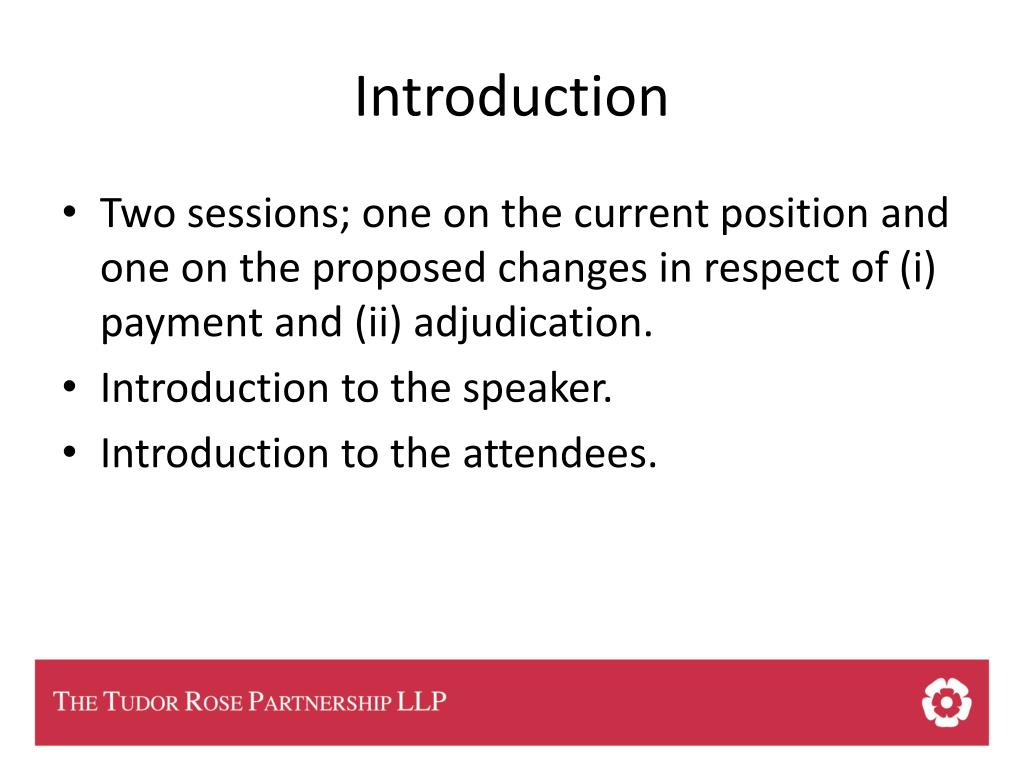 Introduction • Two sessions; one on the current position and one on the proposed changes in respect of (i) payment and (ii) adjudication. • Introduction to the speaker. • Introduction to the attendees. THE TUDOR ROSE PARTNERSHIP LLP