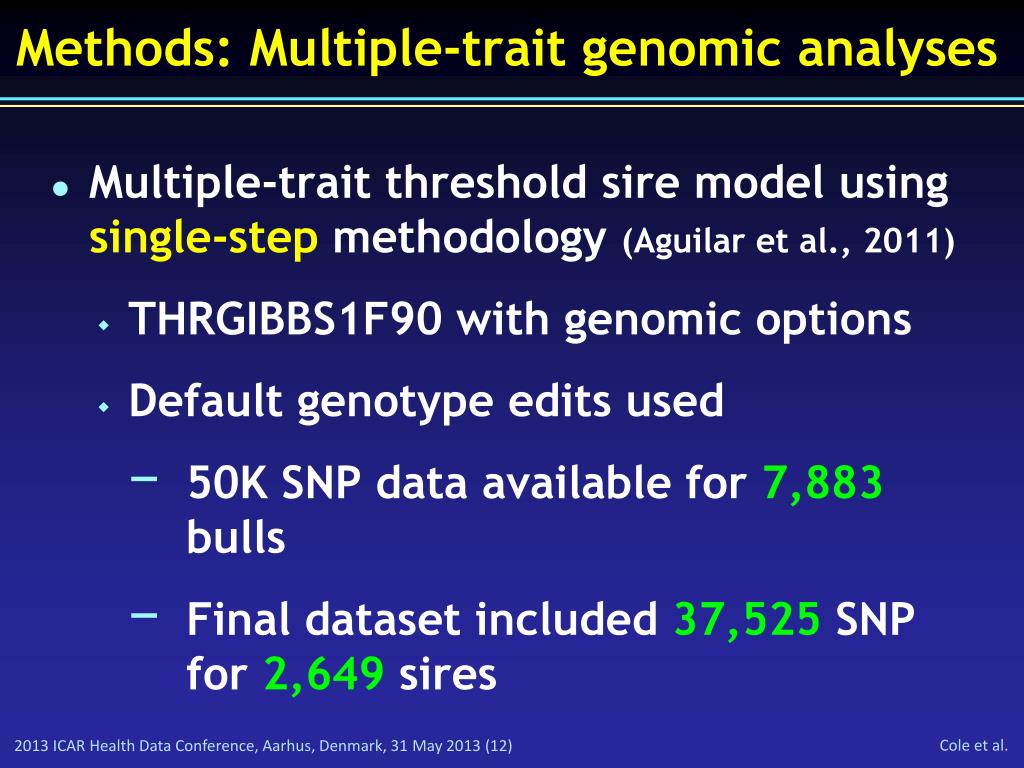 Methods: Multiple-trait genomic analyses • Multiple-trait threshold sire model using single-step methodology (Aguilar et al., 2011) • THRGIBBS1F90 with genomic options • Default genotype edits used • 50K SNP data available for 7,883 bulls • Final dataset included 37,525 SNP for 2,649 sires