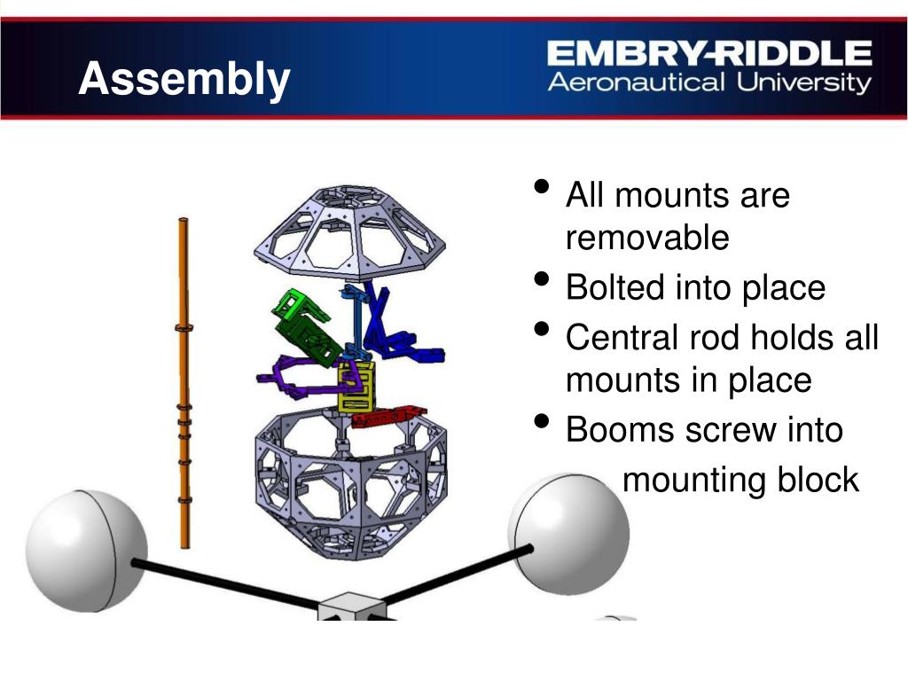 Assembly • All mounts are removable • Bolted into place • Central rod holds all mounts in place • Booms screw into mounting block