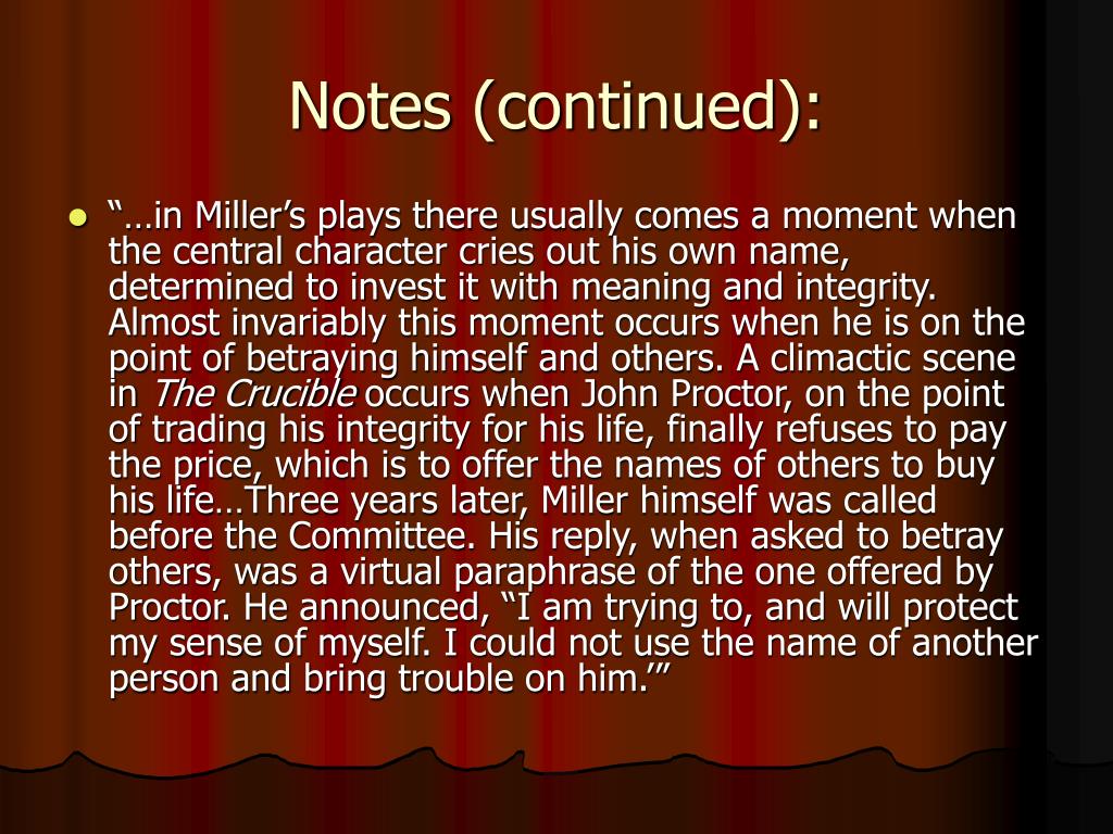 Notes (continued): • “…in Miller’s plays there usually comes a moment when the central character cries out his own name, determined to invest it with meaning and integrity. Almost invariably this moment occurs when he is on the point of betraying himself and others. A climactic scene in The Crucible occurs when John Proctor, on the point of trading his integrity for his life, finally refuses to pay the price, which is to offer the names of others to buy his life…Three years later, Miller himself was called before the Committee. His reply, when asked to betray others, was a virtual paraphrase of the one offered by Proctor. He announced, “I am trying to, and will protect my sense of myself. I could not use the name of another person and bring trouble on him.’”