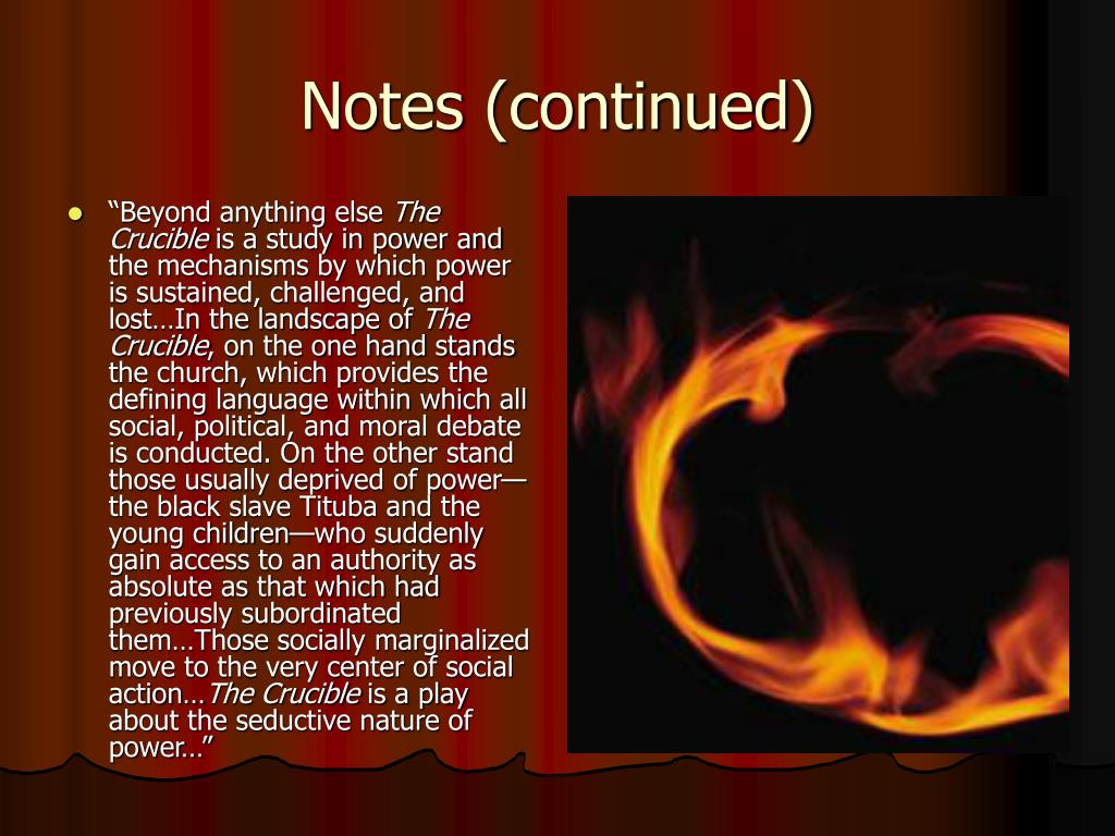 Notes (continued) • “Beyond anything else The Crucible is a study in power and the mechanisms by which power is sustained, challenged, and lost…In the landscape of The Crucible, on the one hand stands the church, which provides the defining language within which all social, political, and moral debate is conducted. On the other stand those usually deprived of power—the black slave Tituba and the young children—who suddenly gain access to an authority as absolute as that which had previously subordinated them…Those socially marginalized move to the very center of social action…The Crucible is a play about the seductive nature of power…”
