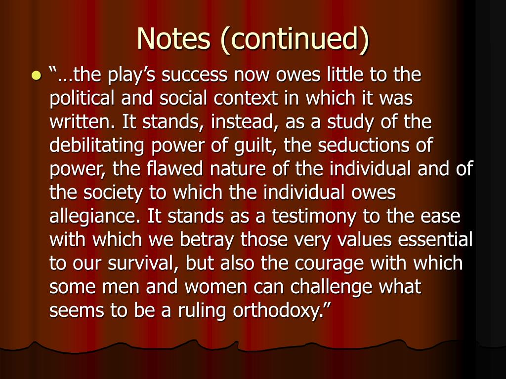 Notes (continued) • “…the play’s success now owes little to the political and social context in which it was written. It stands, instead, as a study of the debilitating power of guilt, the seductions of power, the flawed nature of the individual and of the society to which the individual owes allegiance. It stands as a testimony to the ease with which we betray those very values essential to our survival, but also the courage with which some men and women can challenge what seems to be a ruling orthodoxy.”