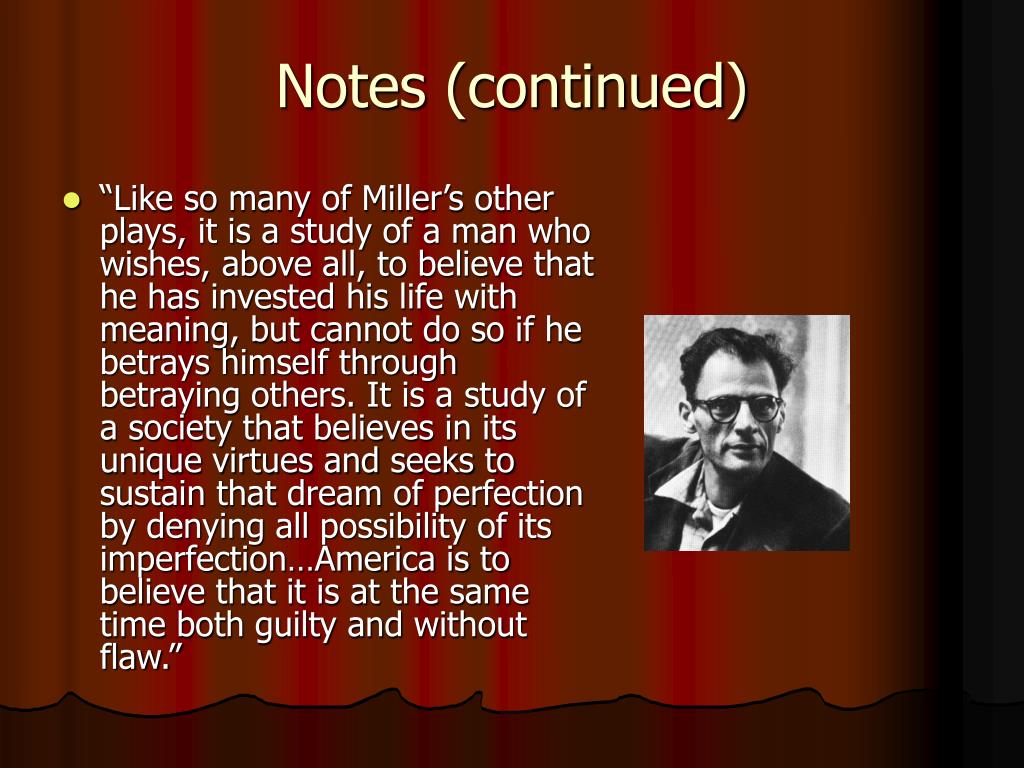 Notes (continued) • “Like so many of Miller’s other plays, it is a study of a man who wishes, above all, to believe that he has invested his life with meaning, but cannot do so if he betrays himself through betraying others. It is a study of a society that believes in its unique virtues and seeks to sustain that dream of perfection by denying all possibility of its imperfection…America is to believe that it is at the same time both guilty and without flaw.”