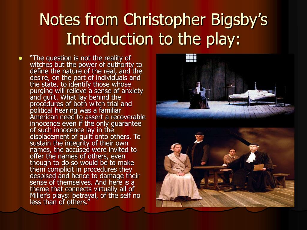 Notes from Christopher Bigsby’s Introduction to the play: • “The question is not the reality of witches but the power of authority to define the nature of the real, and the desire, on the part of individuals and the state, to identify those whose purging will relieve a sense of anxiety and guilt. What lay behind the procedures of both witch trial and political hearing was a familiar American need to assert a recoverable innocence even if the only guarantee of such innocence lay in the displacement of guilt onto others. To sustain the integrity of their own names, the accused were invited to offer the names of others, even though to do so would be to make them complicit in procedures they despised and hence to damage their sense of themselves. And here is a theme that connects virtually all of Miller’s plays: betrayal, of the self no less than of others.”