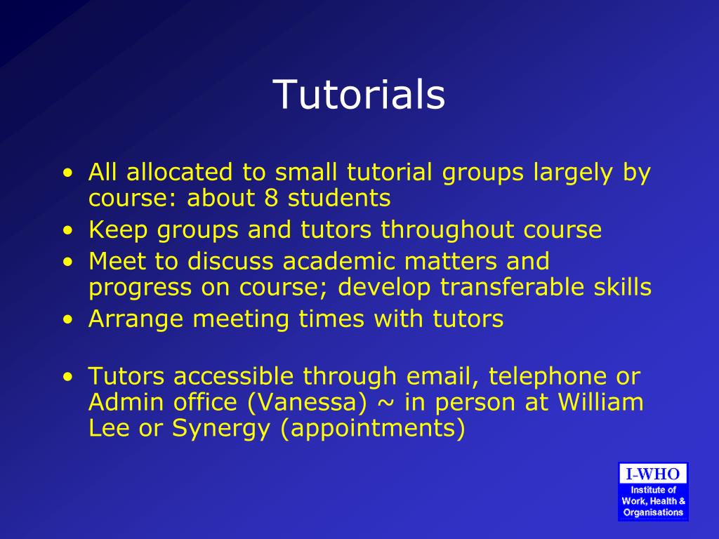 Tutorials • All allocated to small tutorial groups largely by course: about 8 students • Keep groups and tutors throughout course • Meet to discuss academic matters and progress on course; develop transferable skills • Arrange meeting times with tutors • Tutors accessible through email, telephone or Admin office (Vanessa) ~ in person at William Lee or Synergy (appointments)