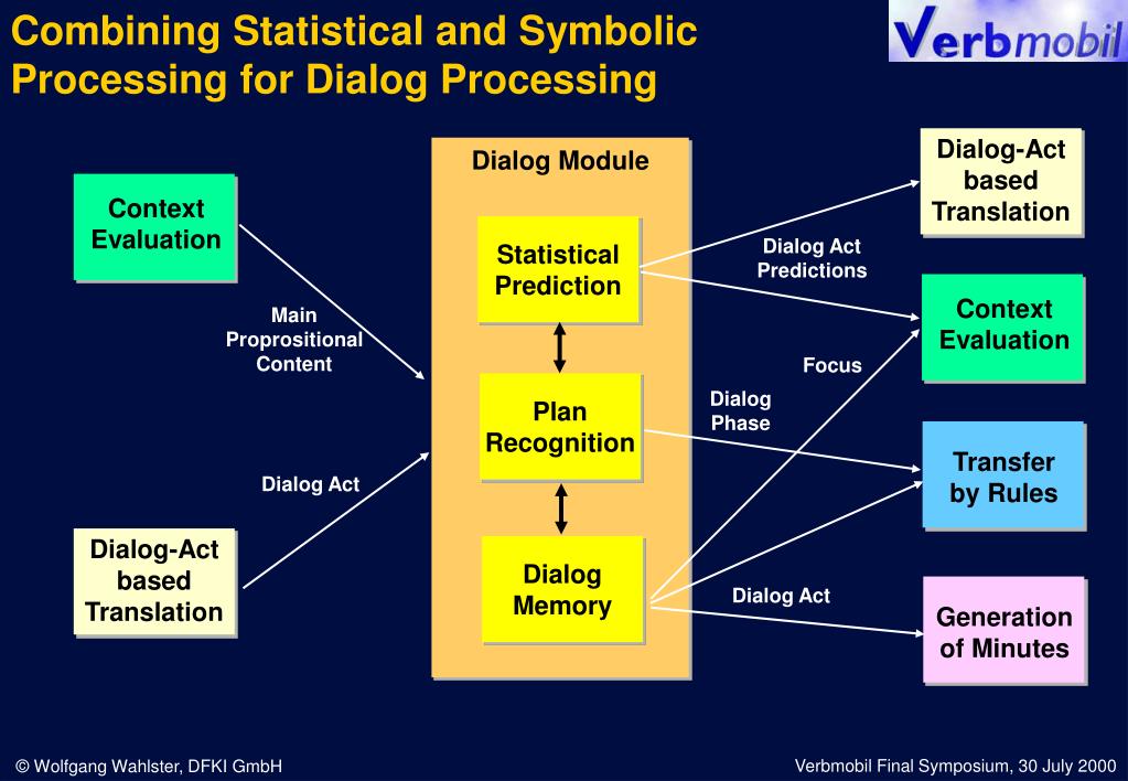 Combining Statistical and Symbolic Processing for Dialog Processing Dialog-Act based Translation Dialog Module Context Evaluation Statistical Prediction Dialog Act Predictions Context Evaluation Main Proprositional Content Focus Plan Recognition Dialog Phase Transfer by Rules Dialog Act Dialog-Act based Translation Dialog Memory Dialog Act Generation of Minutes