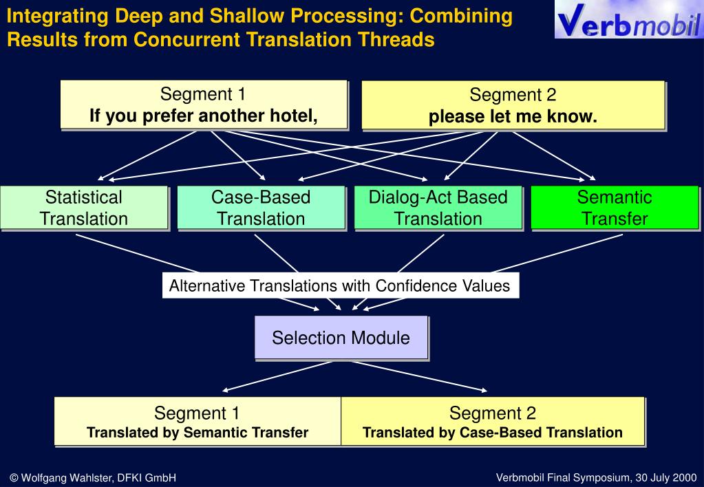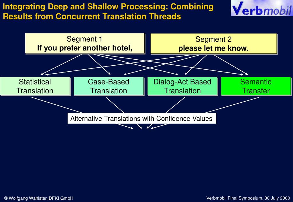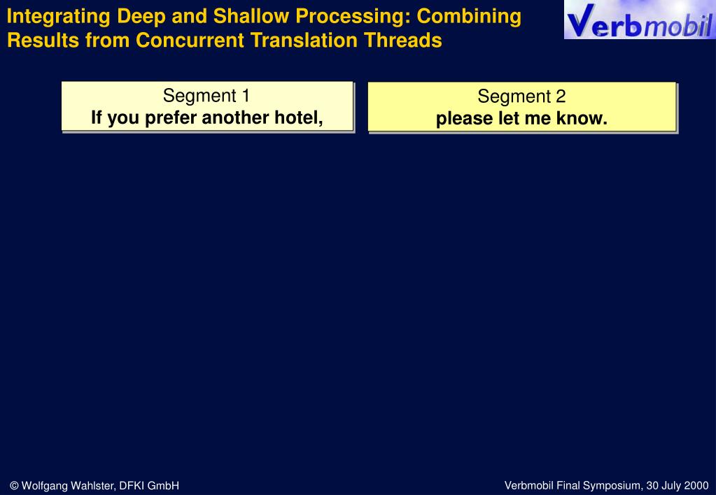 Integrating Deep and Shallow Processing: Combining Results from Concurrent Translation Threads Segment 1 If you prefer another hotel, Segment 2 please let me know. Statistical Translation Case-Based Translation Dialog-Act Based Translation Semantic Transfer Alternative Translations with Confidence Values