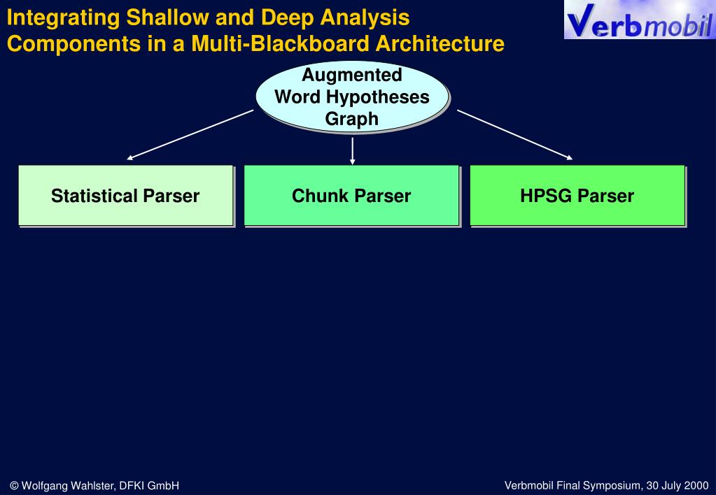 Integrating Shallow and Deep Analysis Components in a Multi-Blackboard Architecture Augmented Word Hypotheses Graph Statistical Parser Chunk Parser HPSG Parser partial VITs Chart with a combination of partial VITs partial VITs partial VITs Robust Dialog Semantics Combination and knowledge- based reconstruction of complete VITs Complete and Spanning VITs