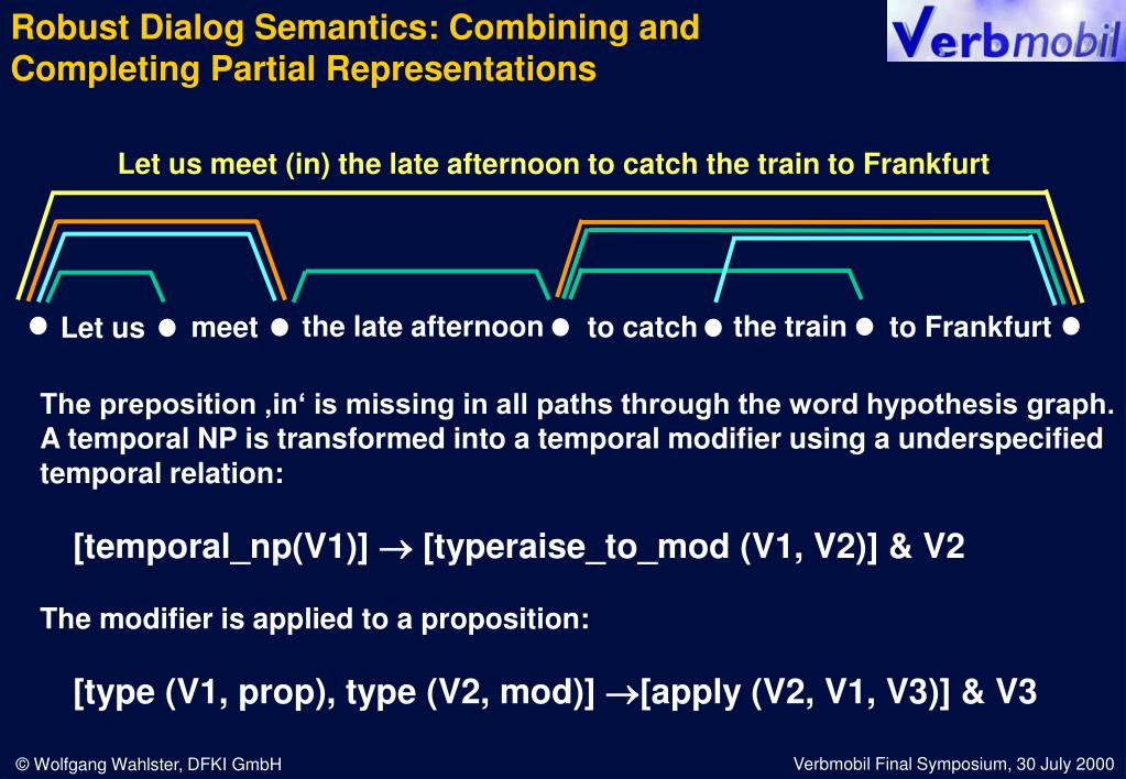 Robust Dialog Semantics: Combining and Completing Partial Representations Let us meet (in) the late afternoon to catch the train to Frankfurt the late afternoon the train to Frankfurt meet to catch Let us The preposition ‚in‘ is missing in all paths through the word hypothesis graph. A temporal NP is transformed into a temporal modifier using a underspecified temporal relation: [temporal_np(V1)] [typeraise_to_mod (V1, V2)] & V2 The modifier is applied to a proposition: [type (V1, prop), type (V2, mod)] [apply (V2, V1, V3)] & V3